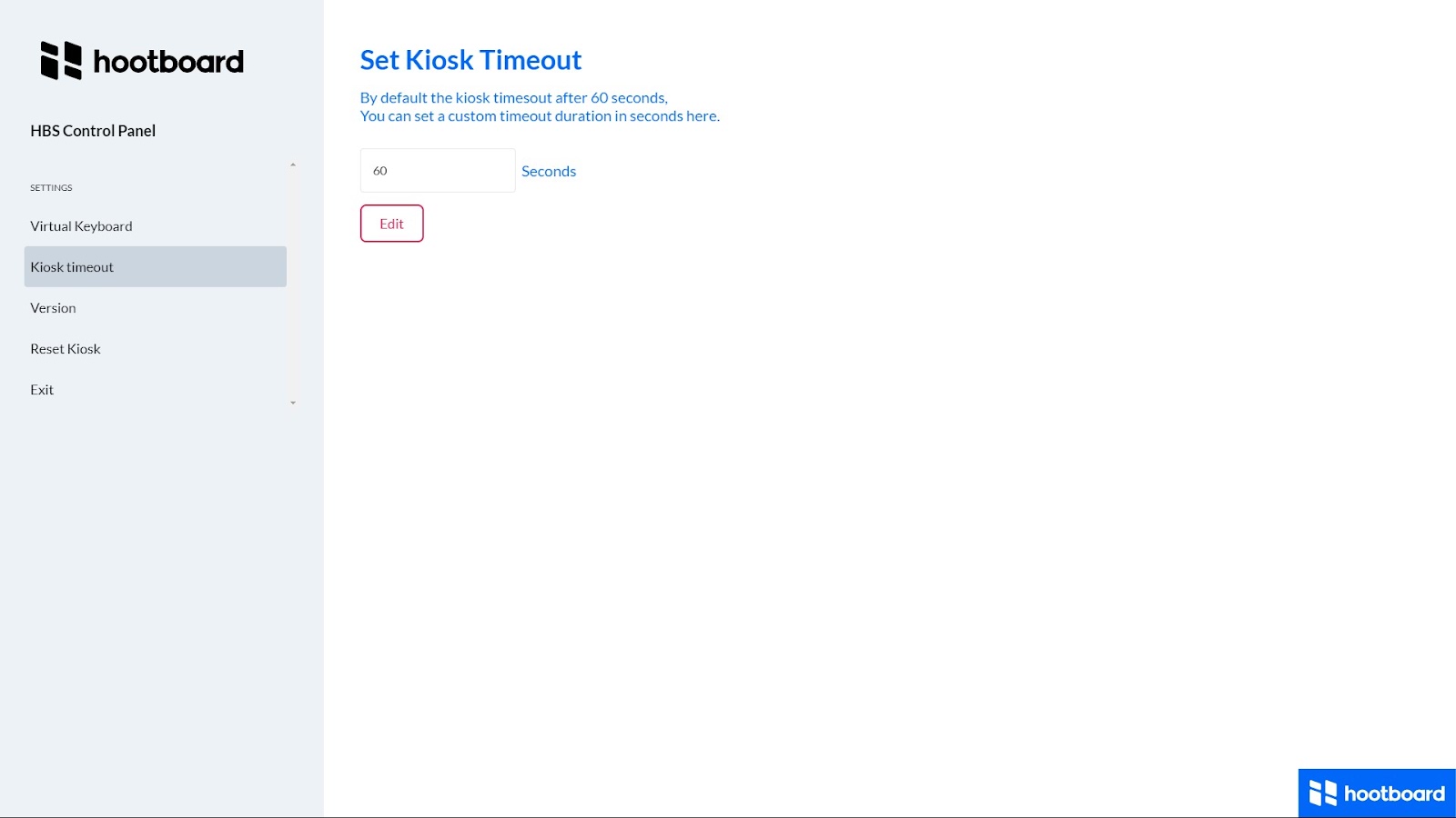 By default the kiosk will time out and end the active session, if there has been no activity for 60 seconds. This timeout can be changed to a custom value from the HBS Control panel.