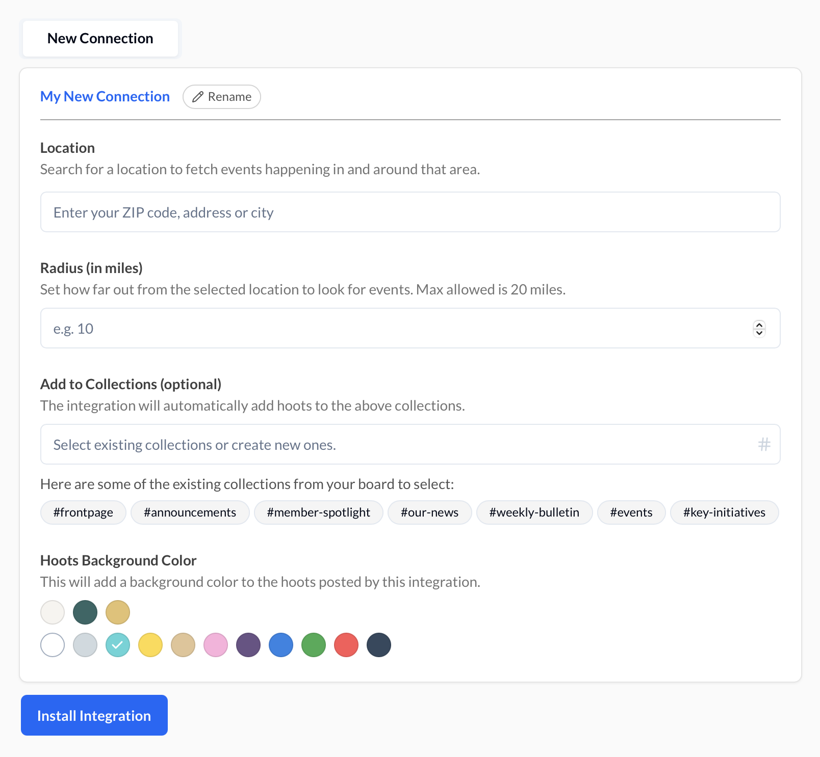 Choose which collections you want the local events to be posted to as Hoots. Collections help keep your content organized for your audience. You can select existing collections or create new ones, like “local-events” or “community-happenings”.