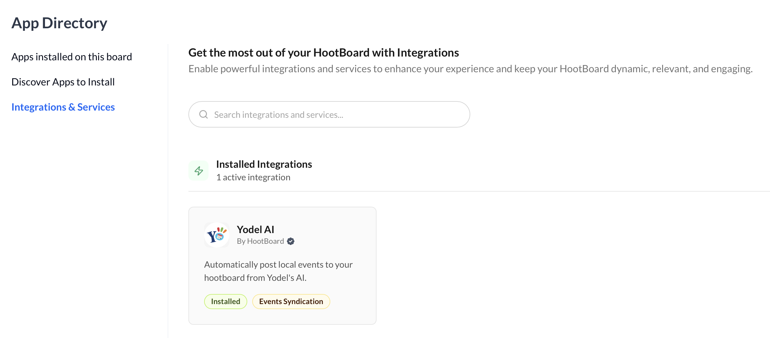 Congratulations! Your integration is now live. Your HootBoard will automatically pull real-time event data from Yodel’s AI event calendar and post it as Hoots based on your settings. Expect new events to appear within 15 minutes of being published.