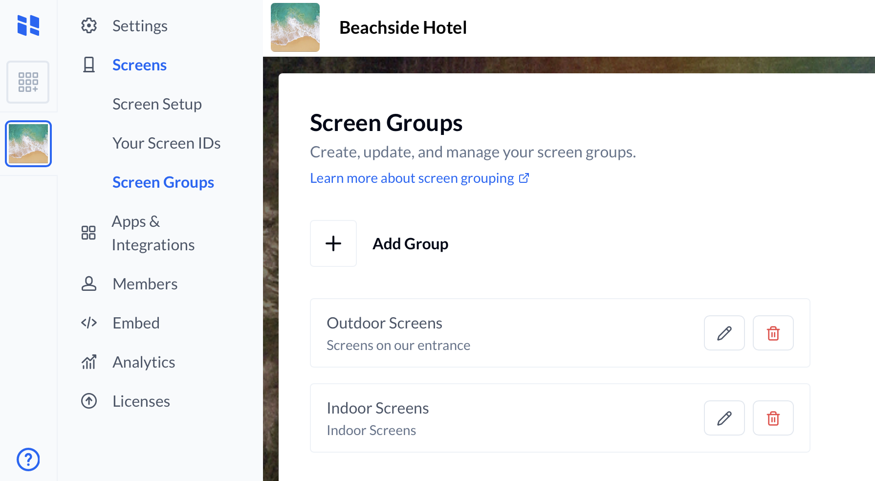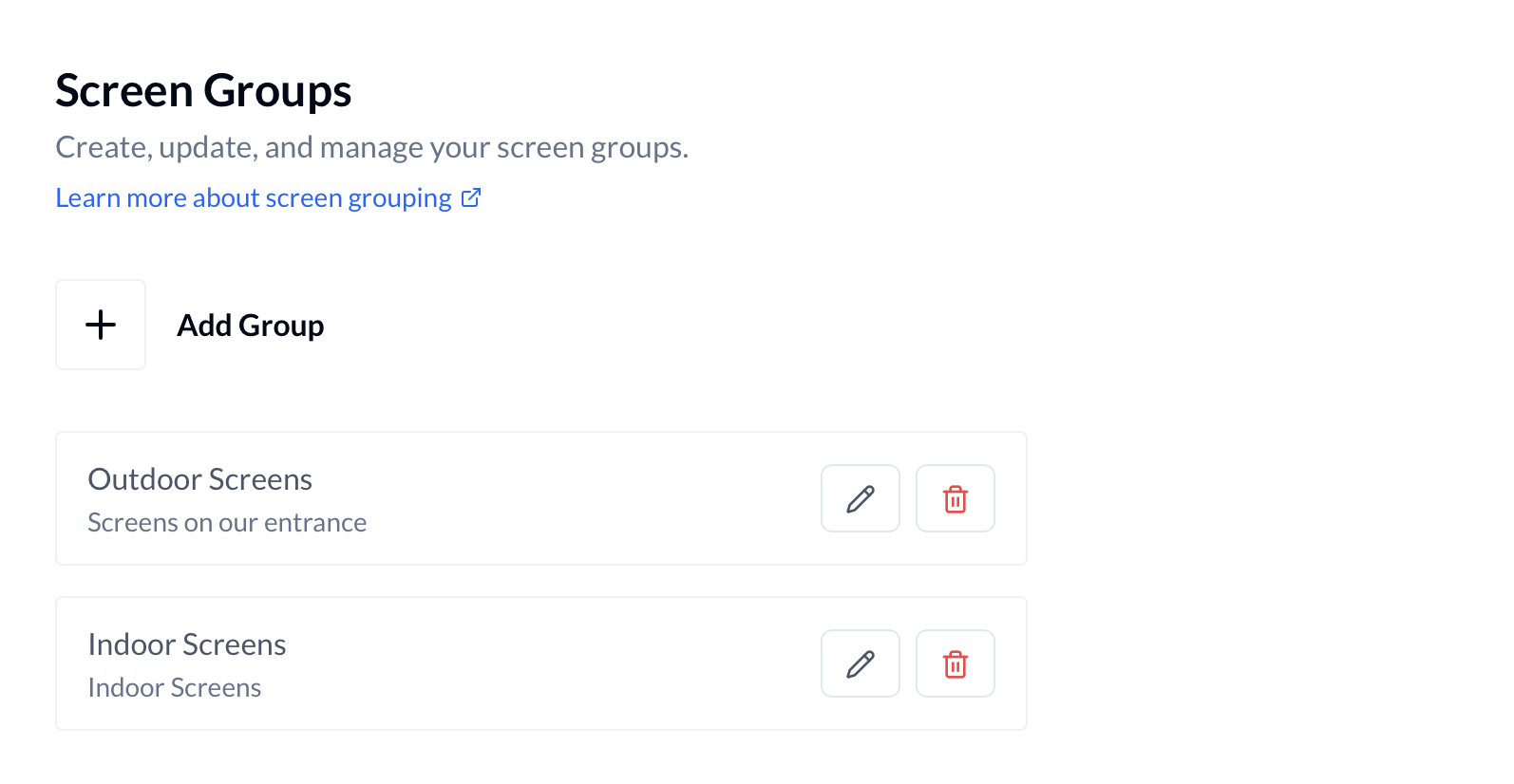 - To update: From the list of screen groups, find the one you wish to change and click the Edit (or pencil) icon. You can then rename the group or update its description.